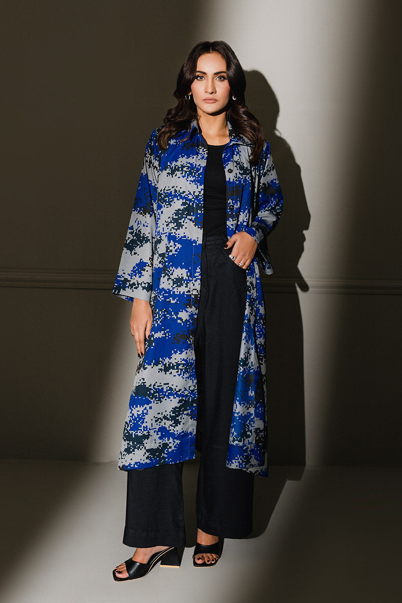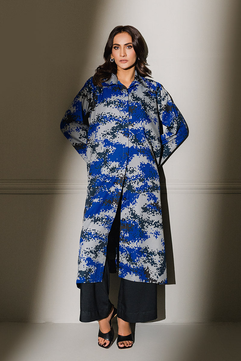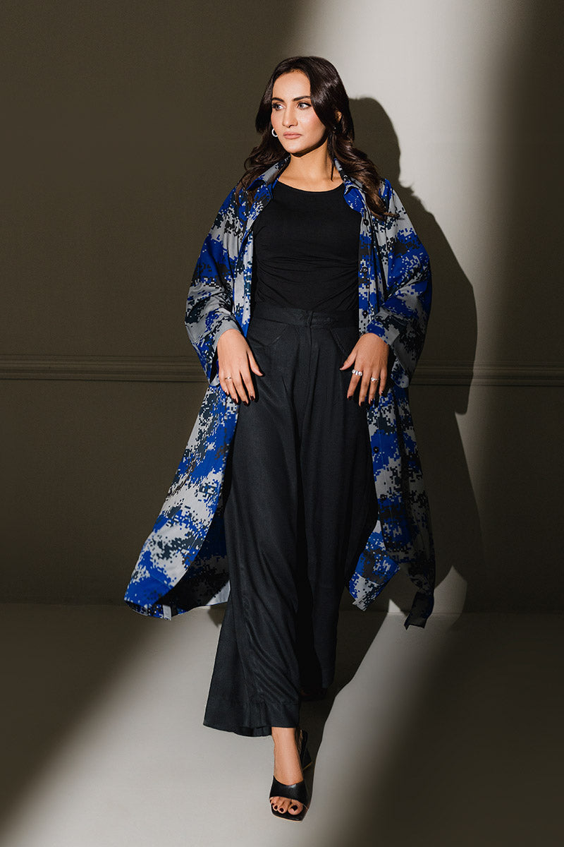 Introducing 'Cloudscape', a sartorial masterpiece that mirrors the ethereal beauty of a painted sky. This beautiful silhouette can be styled in two ways; a button down shirt or an open shrug paired here with our classic flared pants.