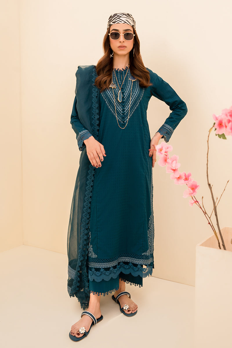 A succulent teal hues serve as the canvas for ˜Eira„¢. Delicate embroideries are laid out in accents of cerulean teal and cream along with layered border detailing. Paired with embroidered organza dupatta and a straight trouser, this exquisite ensemble is quintessential for evening soirees.