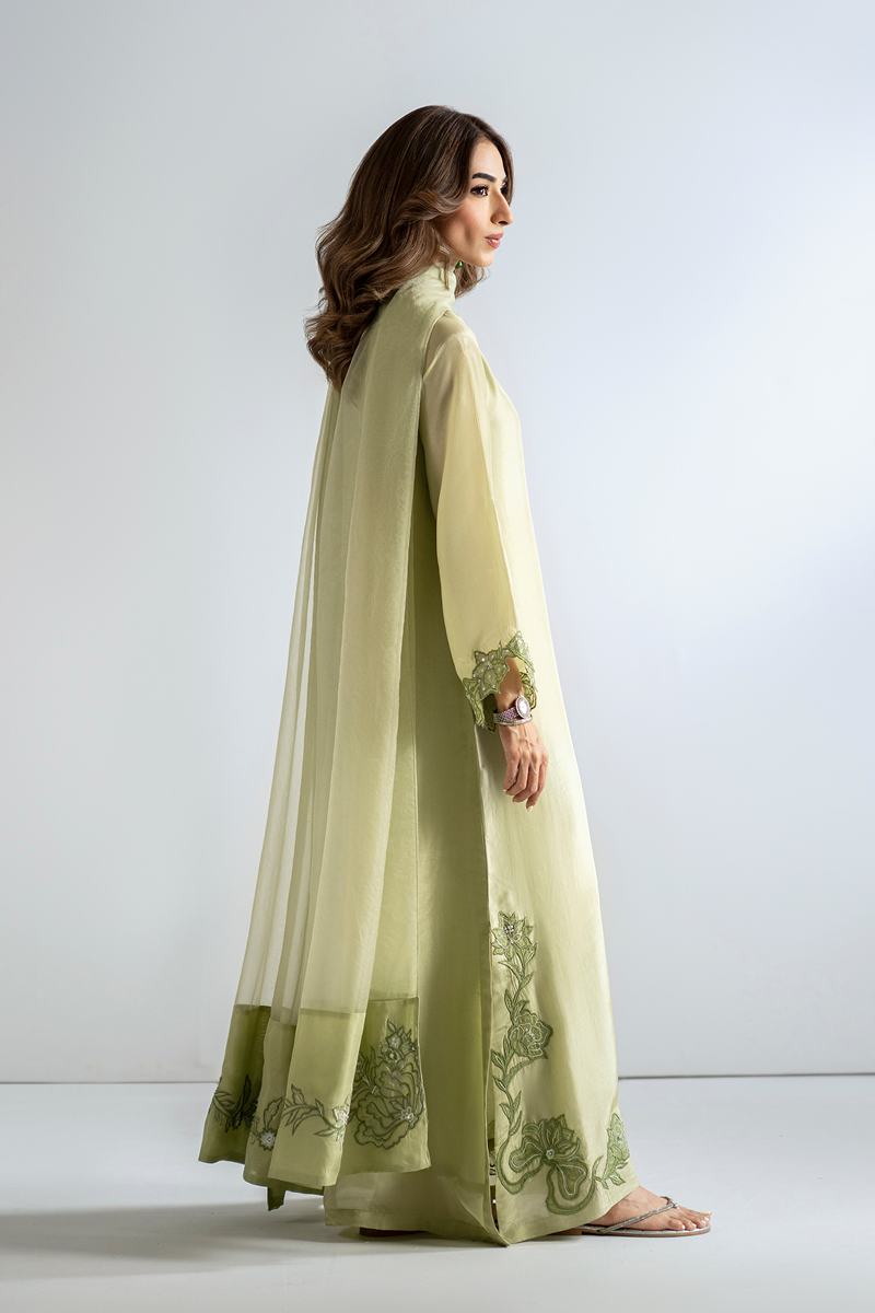 This straight-cut kaftan is a vision of elegance, featuring delicate handwork along the neckline and adda detailing on the bell sleeves. The hem and side slits shimmer with ornate craftsmanship, complemented by straight pants and organza dupatta with medium silk border and heavy embellishments.