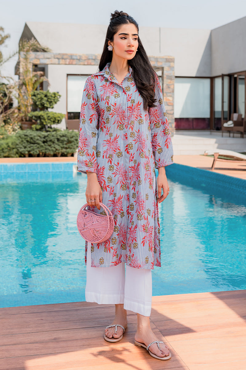 Adorn grace with this blue stripped straight tunic featuring exquisite patterns.