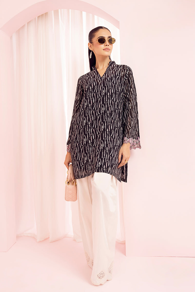Reece is your new go-to summer look. This chic printed shirt is perfect for the summer season and is paired with our signature 'Leah farshi shalwar' featuring cutwork embroidery at the bottom, making it ideal for family get-togethers.