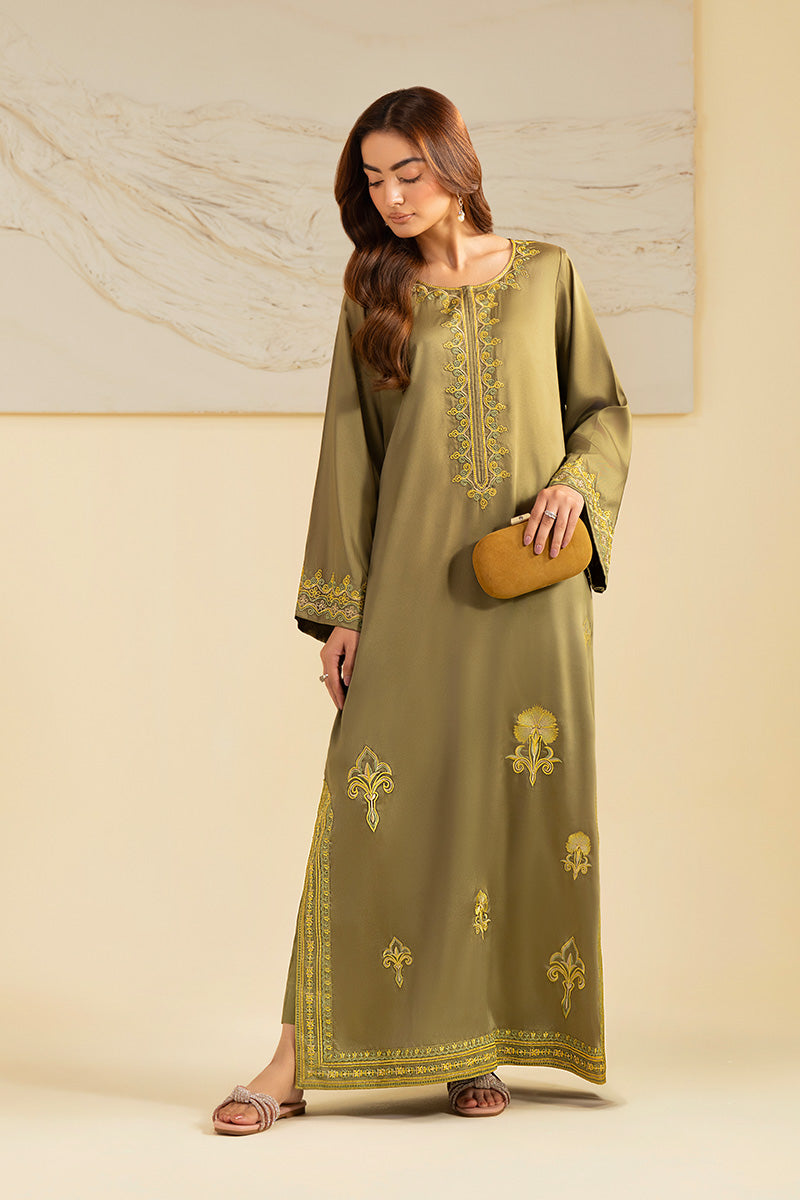 Celebrate in style with this effortlessly chic kaftan, featuring graceful embroidery along the neckline, sleeves, and side slits. Its soft printed design and relaxed silhouette make it ideal for festive gatherings and birthday soirées alike.