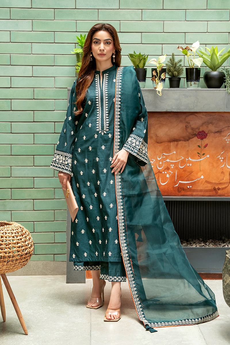 Perfectly designed to celebrate summer style, this emerald ensemble features a straight shirt adorned with intricate black thread embroidery, creating a bold yet graceful contrast. It is paired with culottes featuring delicately embroidered hems and a sheer organza dupatta, richly detailed and finished with contrast tassel, promising effortless sophistication for your festive celebrations.