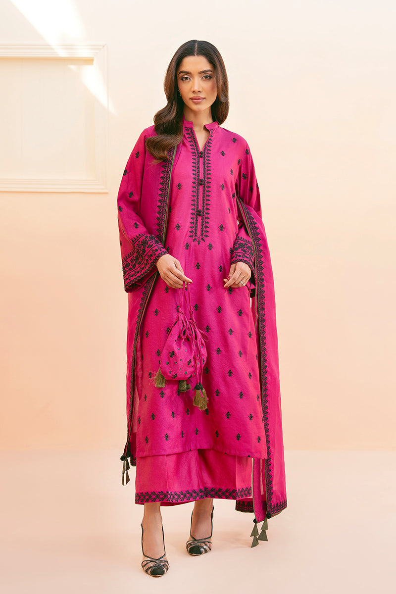 Perfectly designed to celebrate Eid in summer style, this fuchsia pink ensemble features a straight shirt adorned with intricate black thread embroidery, offering a bold yet graceful contrast. It is paired with culottes featuring delicately embroidered hems and a sheer organza dupatta, richly detailed and finished with contrast tassels, promising effortless sophistication for your festive celebrations.