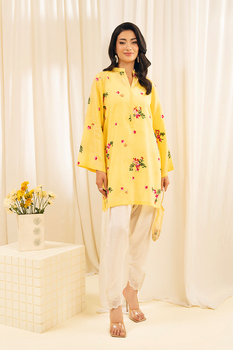 Every detail of this lime yellow ensemble truly screams summer perfection! The soft, breezy straight shirt is beautifully adorned with intricate contrast aari embroidery. Paired with an elegant eve tulip shalwar and a sheer organza dupatta detailed with delicate cutwork embroidery, this outfit is a flawless choice for a stylish summer look.