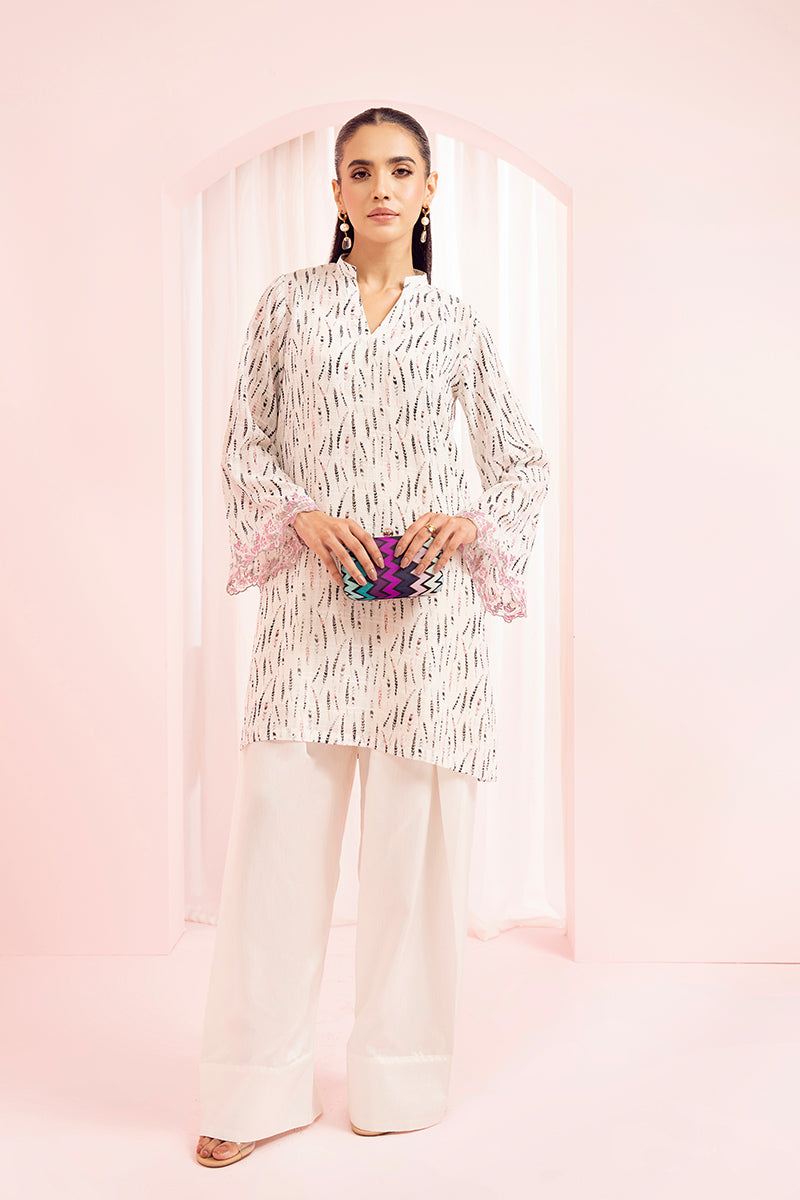 Dress to impress this summer season! This elegant, breezy printed shirt features embroidered flared sleeves, adding detail and beauty to the look. It's paired with our signature 'Rye Shalwar' to complete this gracious outfit.