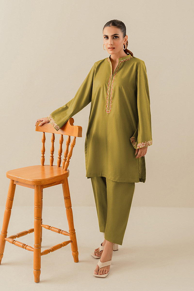 Step into winter with 'Sesame' a stylishly relaxed ensemble that strikes the perfect balance between cultural richness and modern sophistication. The A-line shirt takes center stage, showcasing a centi-band embroidered neckline and sleeve border. Paired seamlessly with a classic shalwar this is a must have wardrobe essential.