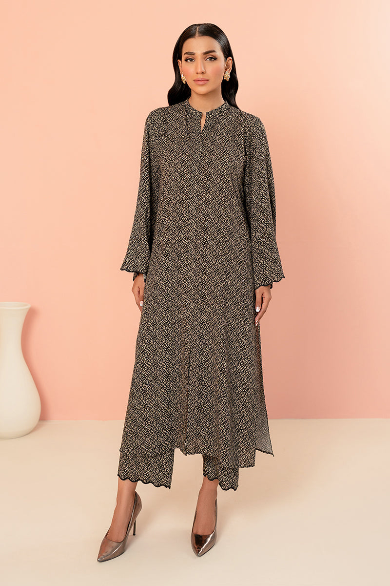 Twirl away in ˜Flaxen„¢ a relaxed semi-open placket silhouette accented with playful patterns and boldly scalloped edged sleeves. Layered overmatching loose trousers this is the ultimate casual-chic outfit for your fall wardrobe.
