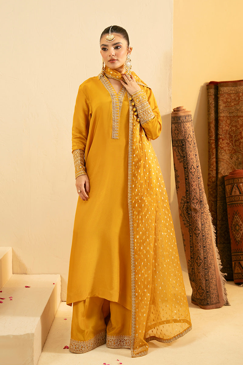 Embrace festive sophistication in this elegant long shirt silhouette, featuring an Indian V-neckline adorned with delicate tila work. Intricately embroidered cuff sleeves add charm, while sequin detailing on the flared trouser hem brings a subtle sparkle. The jacquard organza dupatta, framed with an embroidered border, completes the look with timeless grace.