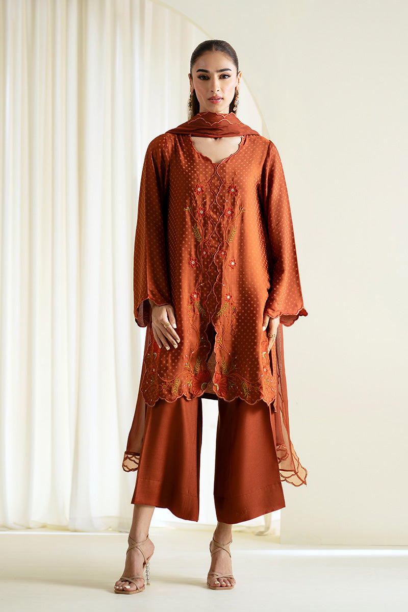 This set is the kind of outfit that makes you feel instantly put together without even trying. The textured long shirt features delicate embroidery and a chic front slit, paired with flowy wide-legged trousers and a soft sheer dupatta — perfect for festive dinners.