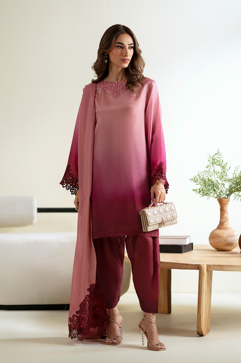 An outfit that feels just as good as it looks — a flowy gradient shirt with delicate embroidery and flared sleeves, paired with a khari shalwar and a silk dupatta for the perfect balance of ease and polish.