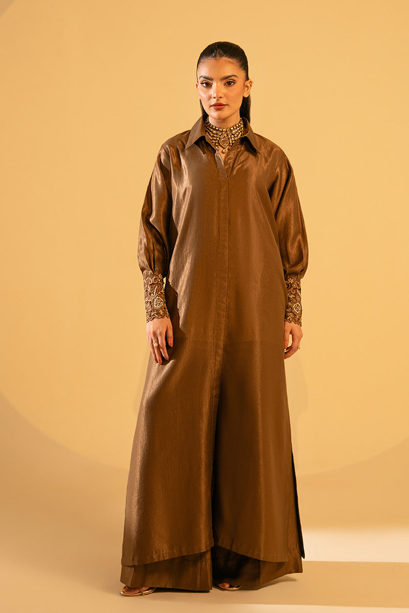 A masterpiece in design — the long shirt is elevated with a refined collar neckline and statement balloon sleeves, adorned with ada work on cuffs. Paired with flared pants, it embodies luxury with modern grace.