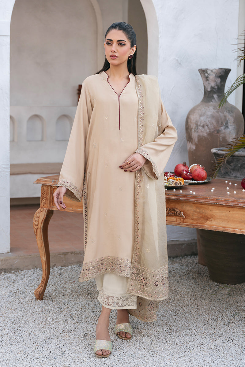 Elevate your Eid style with Esmey an intricately embroidered shirt paired with a sheer dupatta featuring striking contrast embroidery details perfect for a refined Eid look. Style it with Zola culottes for an ensemble that is both elegant and effortless.