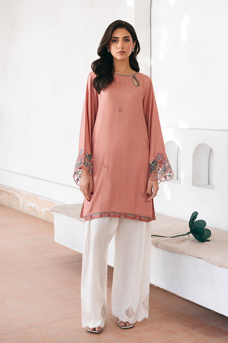 A celebration of timeless style is designed for those who adore intricate details. The embroidered short shirt, paired with a stunning jaal dupatta, captures the essence of Eid elegance. Contrasting hues bring depth to the ensemble, while the Leah Farsi shalwar completes the look with effortless sophistication.