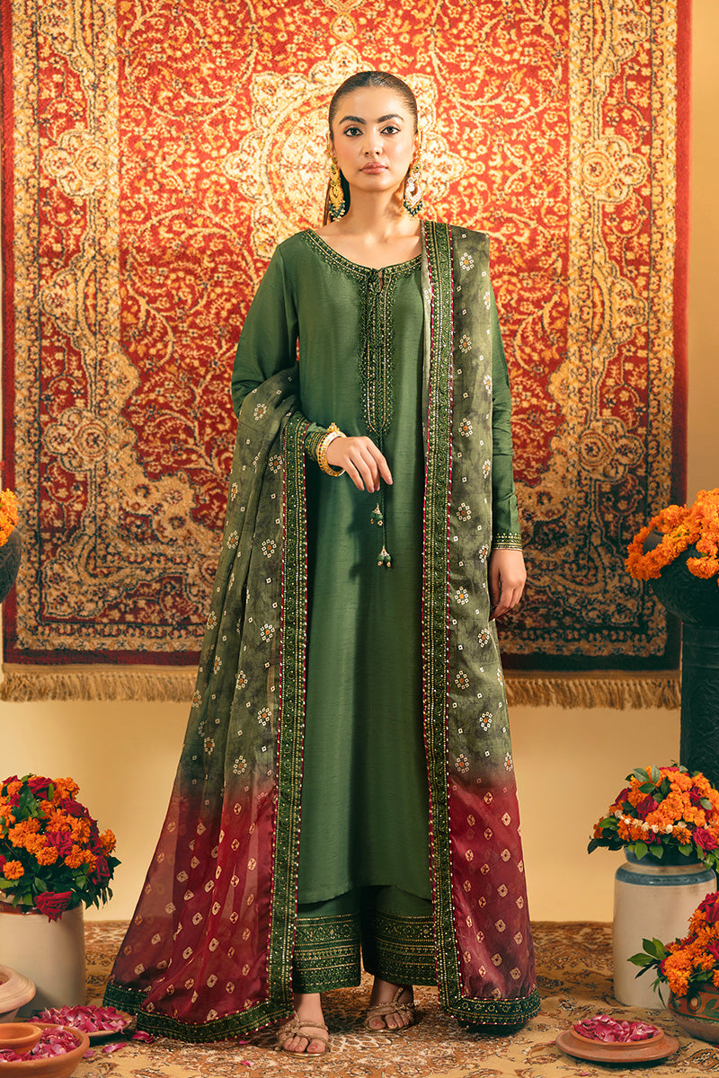 A celebration of craftsmanship and color — this A-line shirt boasts an embellished neckline and artfully adorned sleeves. Complemented by wide-leg trousers with exquisite embroidered hems and a chunri-printed dupatta edged with embellishments, it’s the ultimate expression of festive sophistication.