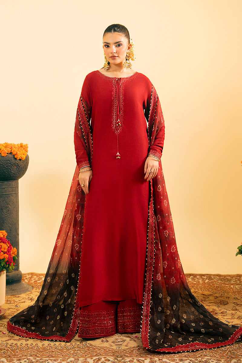 Crafted with festive artistry, this A-line ensemble showcases an embellished neckline and delicately adorned sleeves. Wide-leg trousers with embroidered hems and a radiant chunri-printed dupatta framed with a gleaming border complete this elegant expression of celebration.