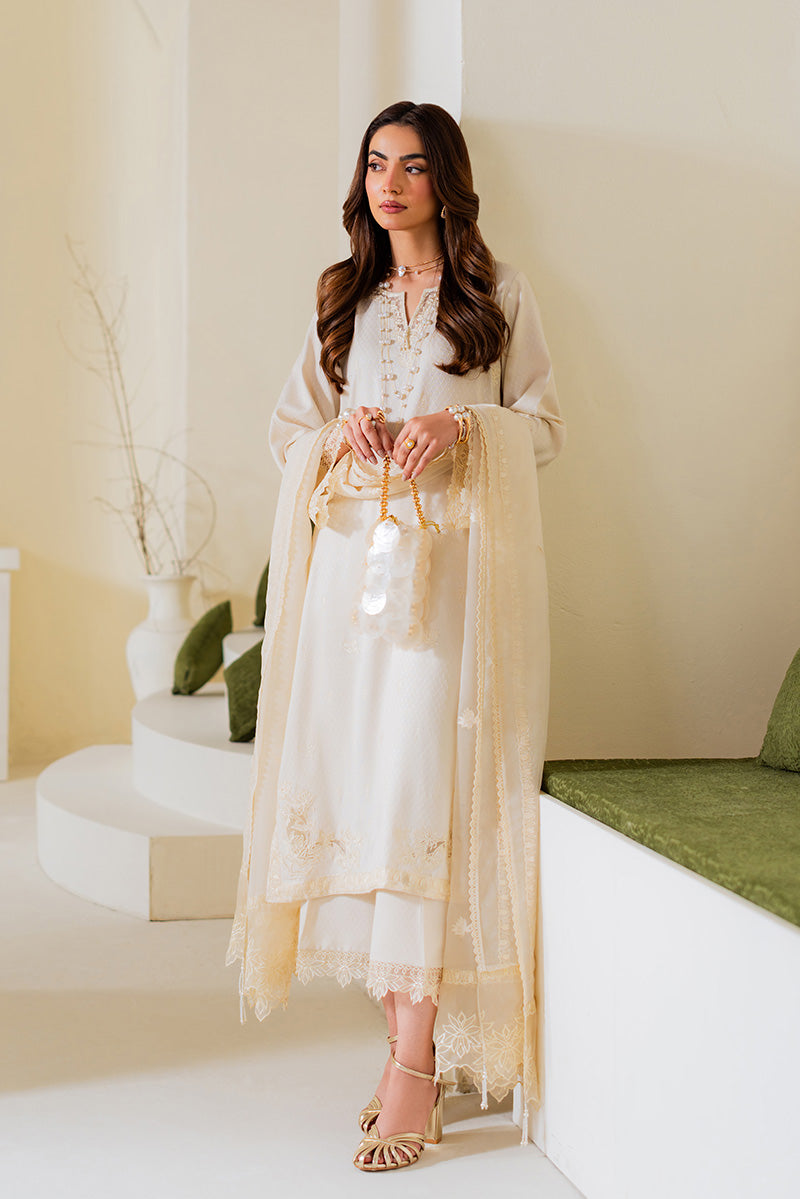 An elegant A-line silhouette crafted to make a statement, this all-over embroidered shirt features a beautifully detailed V-neckline that adds a refined touch. The flared sleeves are enhanced with intricately embroidered cuffs and delicate scalloped edges, bringing graceful movement and charm to the design. Paired with culottes finished with an embroidered hem, the ensemble is completed with a dreamy off-white organza dupatta adorned with cutwork embroidery on the pallu. A timeless choice, perfect for an elevated Eid look and beyond.