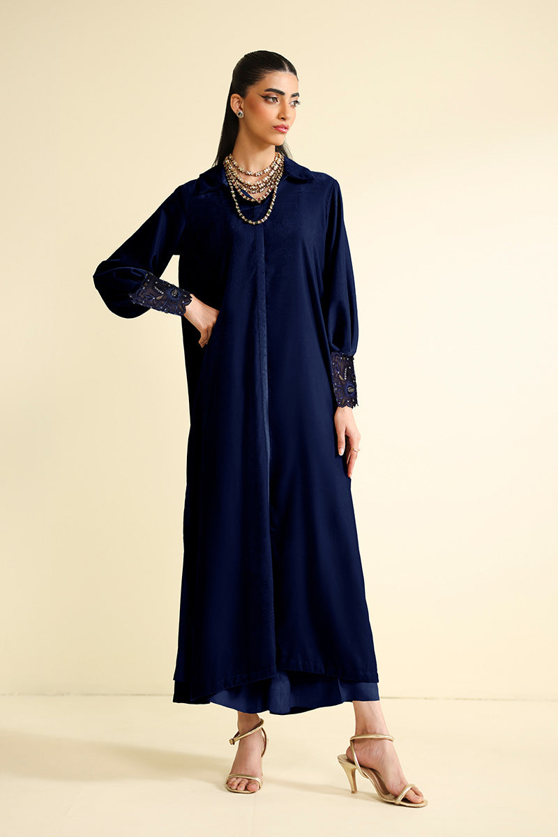 An epitome of refined glamour — this long shirt is defined by its elegant collar neckline and balloon sleeves, accentuated with intricately ada work on cuffs. Paired with flowing flared pants, the ensemble captures the essence of timeless luxury and modern grace.