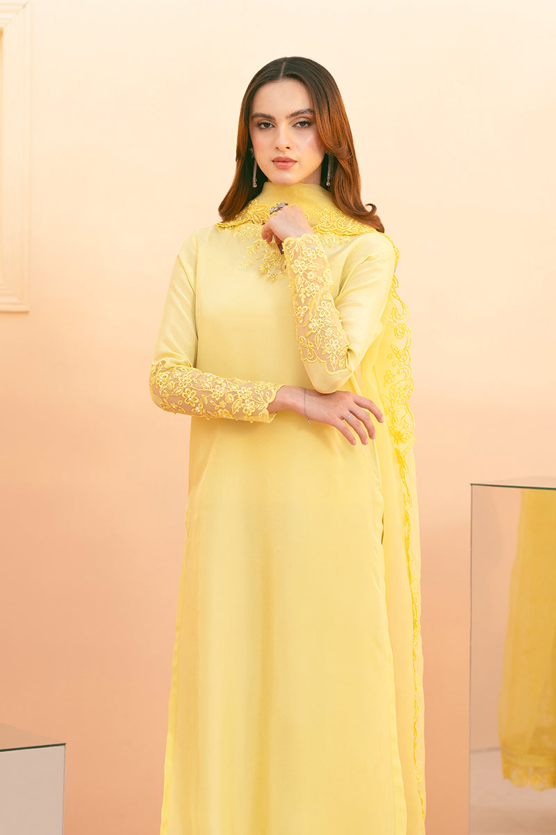 Make your Eid dreams a reality with La Ruhe - Eid Luxe. An exquisite ensemble featuring heavily embroidered and pearl-embellished neckline and sleeves create a festive statement, complemented by matching culottes. Enhance the look further with the heavily embellished organza dupatta, making it perfect for Eid get-togethers.