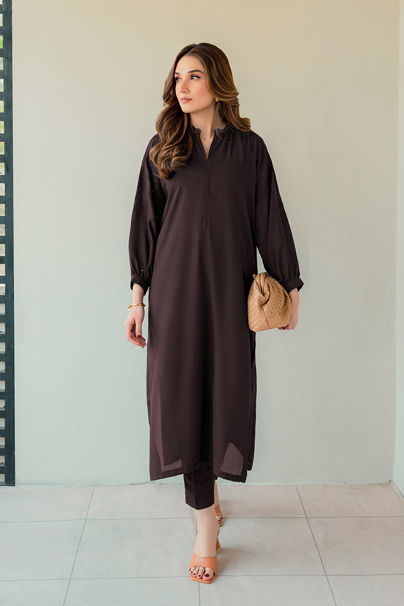 Step into a refreshing spectrum of tones with 'Cacao' a regal dark brown ensemble featuring intricate cutwork embroidery on the sleeves and neckline. Paired with straight trousers, it effortlessly blends casual comfort and chic allure in perfect harmony.