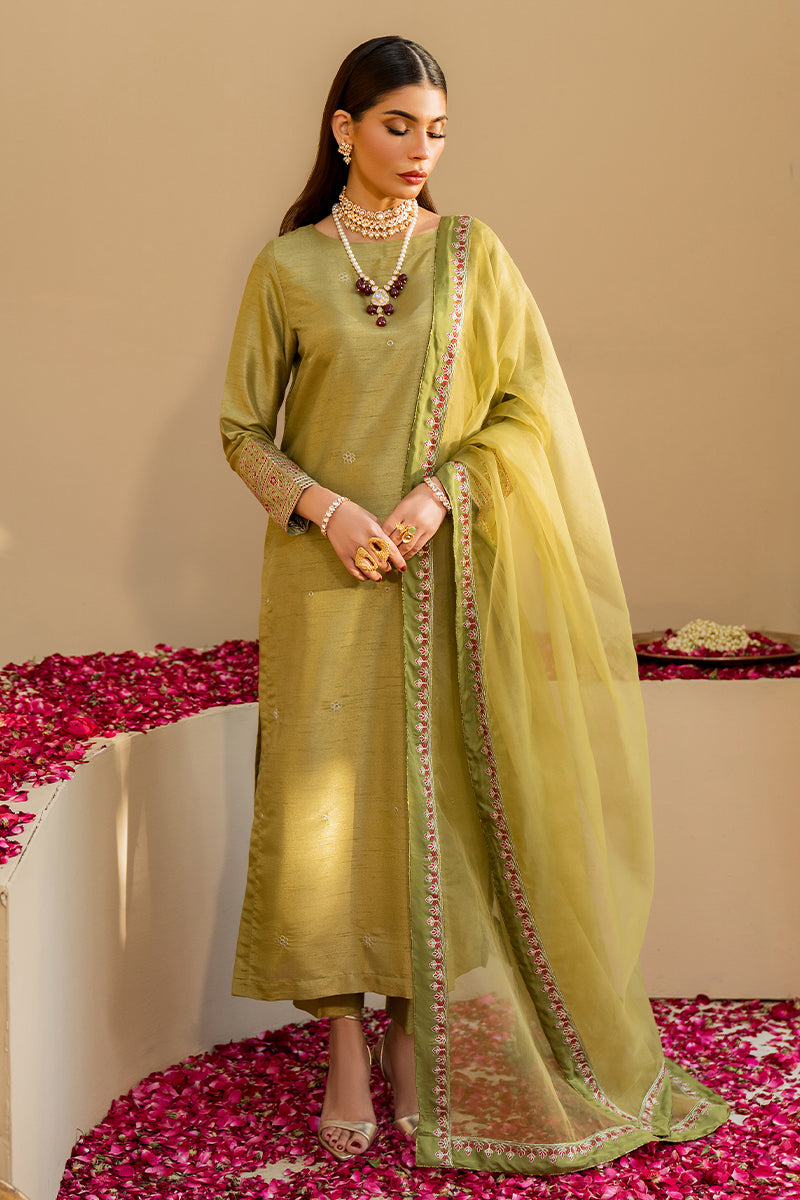 Ayleen - This olive green raw silk embroidered straight shirt with embroidery on dupatta is perfect for a special occasion. The raw silk fabric is soft and luxurious, and the embroidery adds a touch of sophistication.