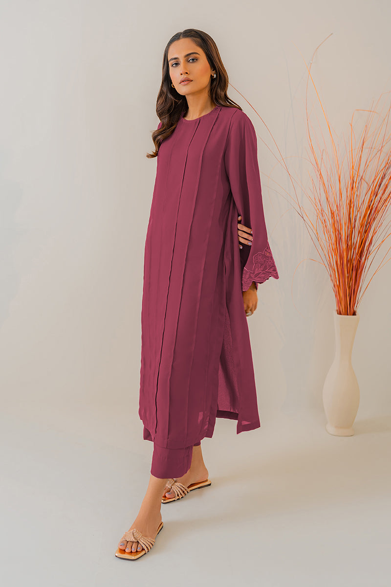 Make a graceful statement with ˜Beverly„¢, an intricately pleated two-piece ensemble in pink paired with matching pants and embroidery on sleeves. This is surely going to brighten up your wardrobe.