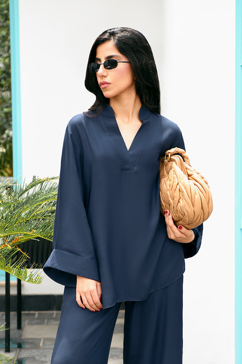 Whether it’s a quick coffee catch-up or an impromptu lunch date, this co-ord set has you covered, featuring a short V-neckline shirt with flared cuff sleeves and matching flared trousers with pockets — a flattering blend of ease and elegance.