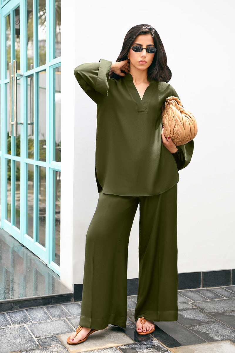 Whether it’s a quick coffee catch-up or an impromptu lunch date, this co-ord set has you covered, featuring a short V-neckline shirt with flared cuff sleeves and matching flared trousers with pockets — a flattering blend of ease and elegance.