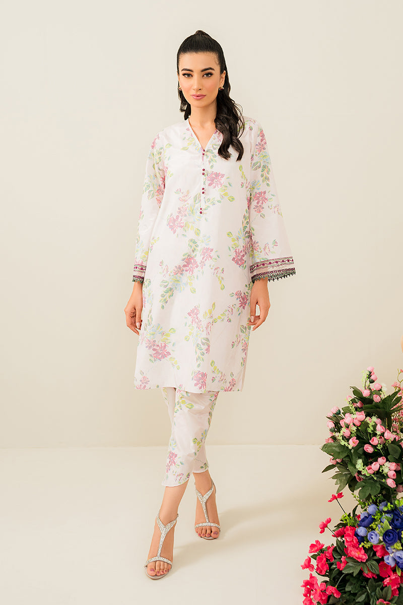 Create a fashion forward statement with our printed floral two-piece co-ord featuring tulip shalwar.