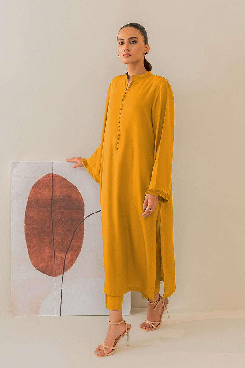 Citron - Unveiling a chic two-piece ensemble adorned with trendy loop buttons and subtle frayed edges, this set perfectly melds laid-back comfort with sophisticated allure. Seamlessly paired with matching straight trousers to complete the look.