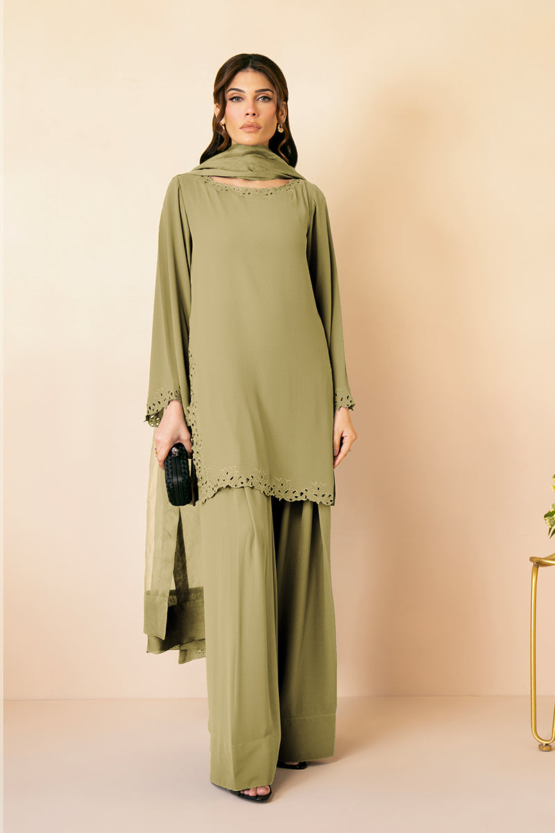 Lets get you into the 'Clara Set' ASAP! Featuring embroidered details on the sleeves and hem, paired with matching flared shalwar and organza dupatta, its the perfect choice for your next family gathering.