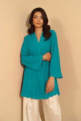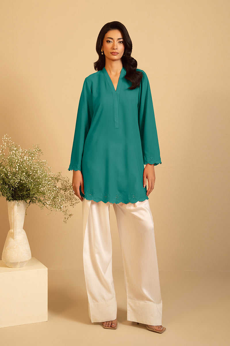 Cleo kiwi offers the perfect balance for casual yet stylish summer lunches. Featuring delicate cutwork embroidery, it pairs beautifully with 'Rye' shalwar for an effortlessly chic look.