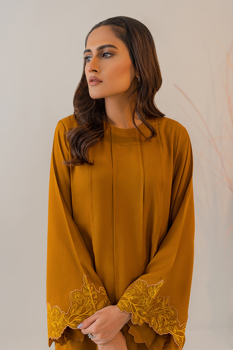 Make a graceful statement with ˜Darcy„¢, an intricately pleated two-piece ensemble in mustard paired with matching pants and embroidery on sleeves. This is surely going to brighten up your wardrobe.