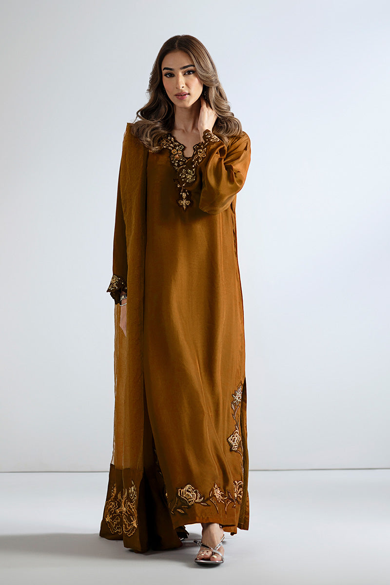 A vision of timeless elegance, this straight-cut kaftan features delicate handwork along the neckline, accentuated with intricately detailed bell sleeves and an opulently embellished hem and side slits. Paired with straight pants and organza dupatta framed with a medium silk border and delicate embellishments, this design radiates refined luxury and effortless sophistication.