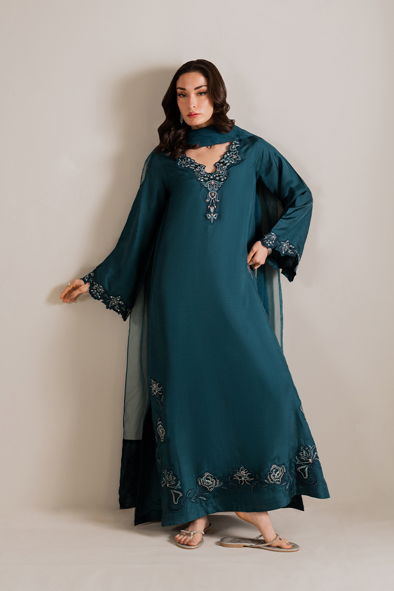 An exquisite straight-cut kaftan, elevated with meticulous handwork along the neckline. Bell sleeves cascade effortlessly, adorned with intricate detailing, while the richly embellished hem and side slits add a touch of refined opulence. Styled with straight pants and an organza dupatta framed by a medium silk border, lavishly detailed with heavy embellishments—an ensemble that embodies timeless luxury.