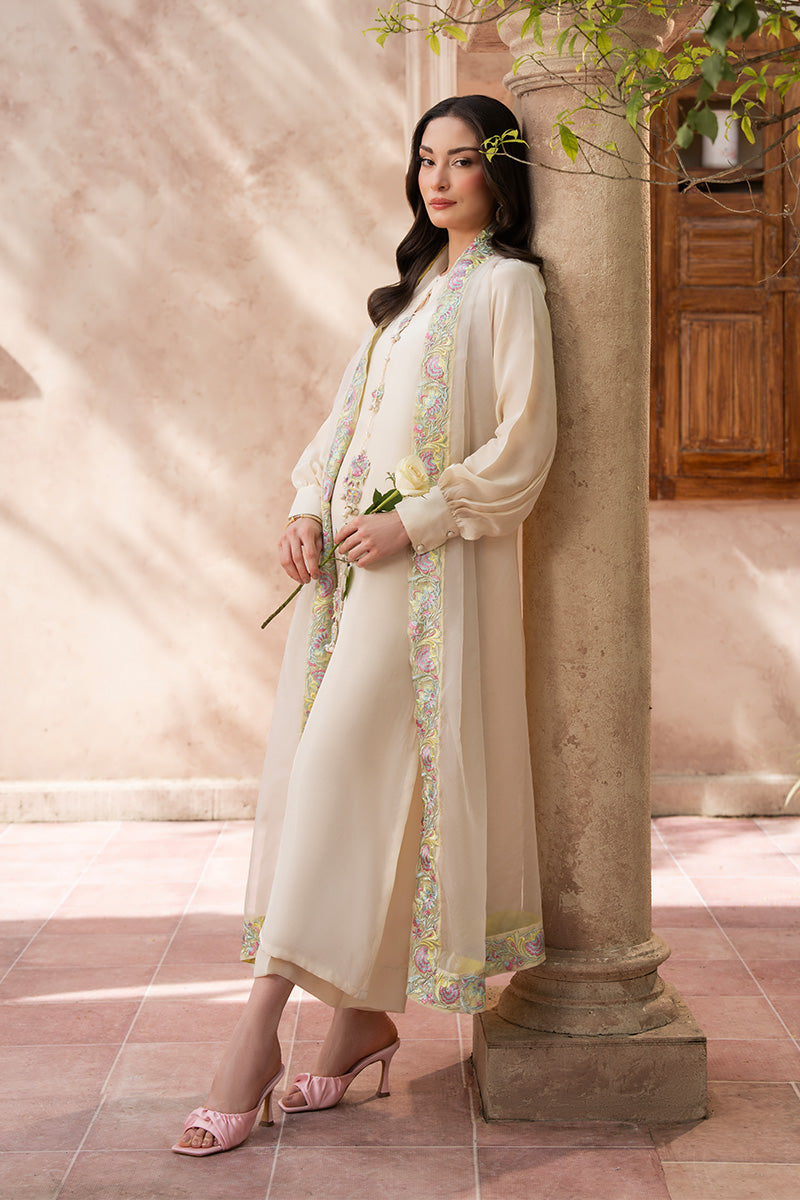 This statement ensemble in luxurious tassel silk captures effortless sophistication with its flowing A-line shirt. The keyhole neckline is richly embellished with contrast embroidery and finished with elegant tassels for added dimension. Cuff sleeves detailed with buttons offer a refined, contemporary edge. The matching tassel silk culottes enhance the silhouette with their sleek and modern appeal. Completing the look is a delicate organza dupatta, adorned with a beautifully embroidered contrast border and subtle facing. A harmonious blend of texture and craftsmanship, this piece radiates elevated style.