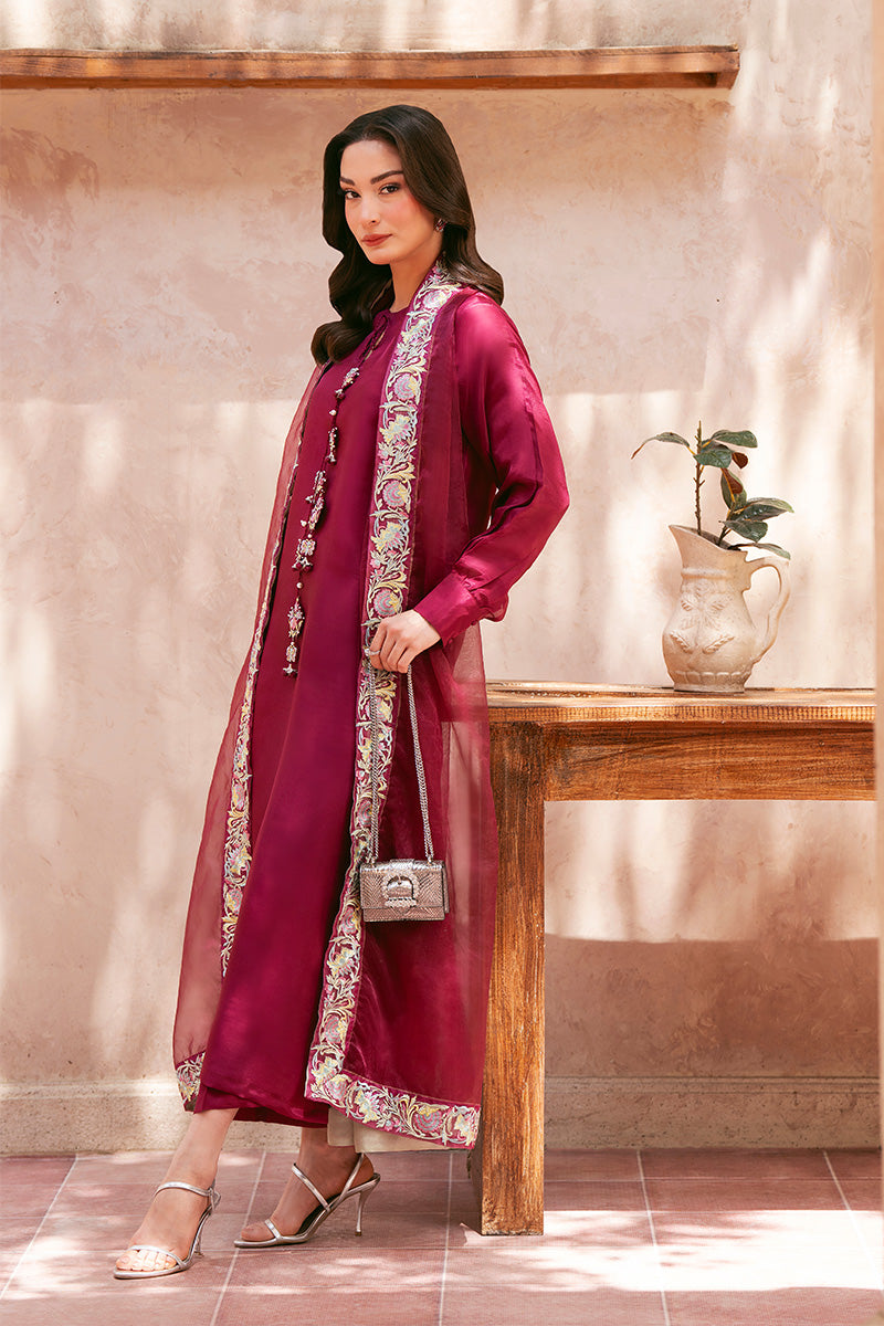 This luxurious ensemble is crafted from sumptuous tassel silk, featuring an elegant A-line shirt that drapes effortlessly for a refined silhouette. The keyhole neckline is beautifully accentuated with heavy contrast embroidery and delicate tassels, adding a touch of artisanal opulence. Cuff sleeves with button details introduce a subtle structure, enhancing the overall sophistication. Paired with tailored tassel silk culottes, the outfit balances comfort with elevated style. The look is completed with a sheer organza dupatta, adorned with a finely embroidered contrast border and soft contrast facing for graceful movement. A perfect blend of timeless elegance and modern refinement, this ensemble exudes understated luxury.