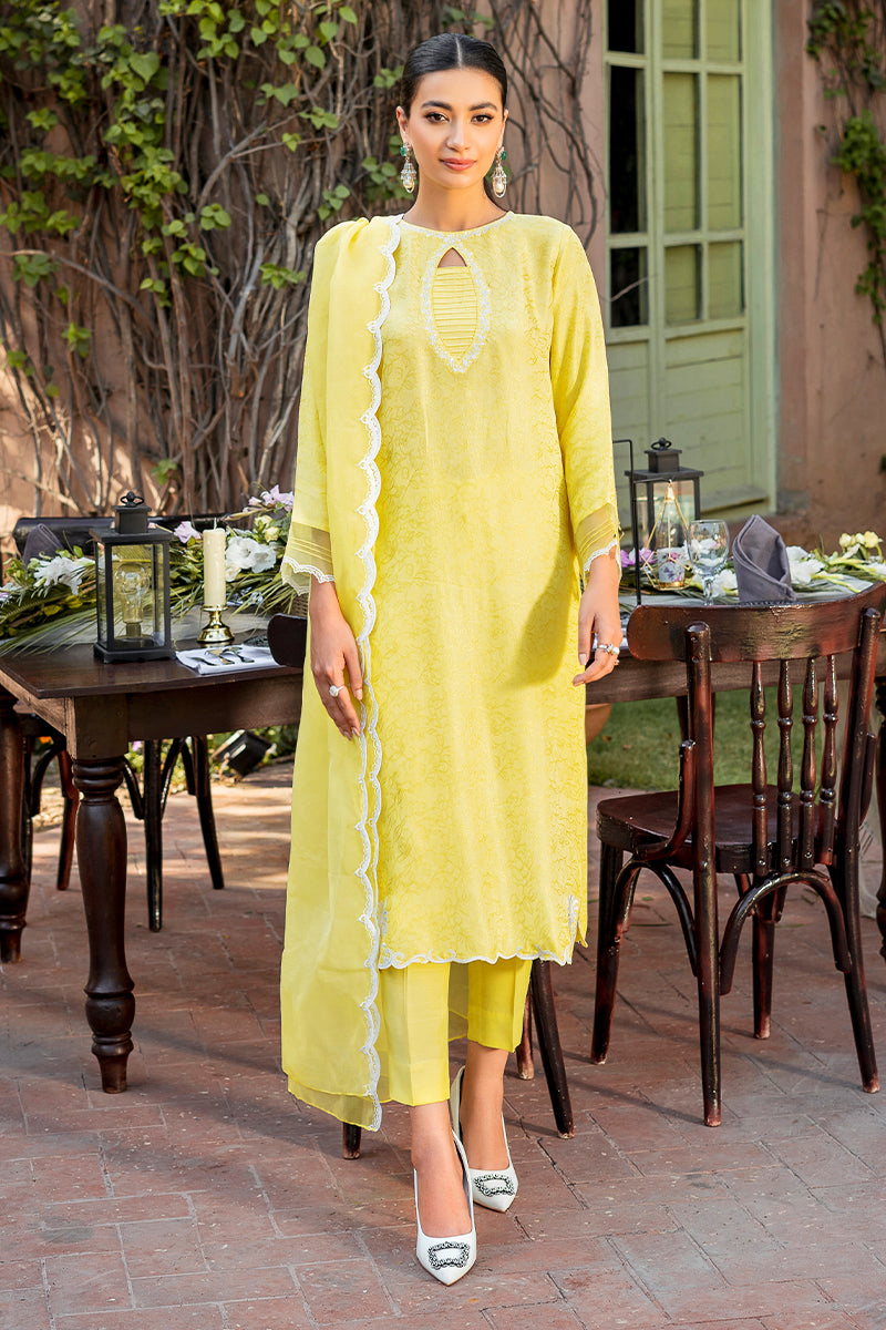 Experience the ultimate grandeur in this ready to wear yellow ensemble. Emrys features an elongated shirt, enhanced with an embroidered keyhole neckline with pleat detailing and sleeves are enhanced with extended organza pleats and embroidery detail at the opening. Side slits and hemline of the shirt is adorned with cutwork embroidery detail and an intricate motif on each corner. Paired with matching pants and an organza dupatta with cutwork embroidery detail, this elegant outfit is a must have for the summer festive season.