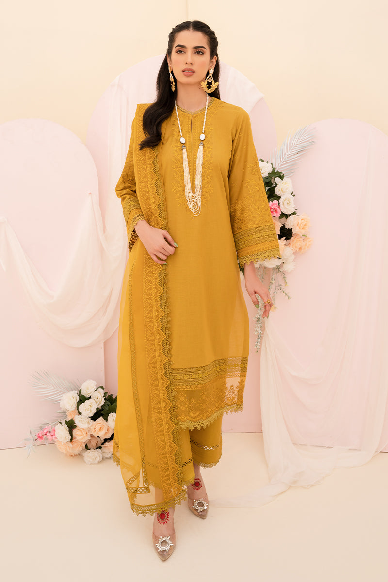 with intricate embroidery patterns to depict vivid hues of mustard and paired with an straight trouser this design is exquisitely sublime and stylishly for this eid.