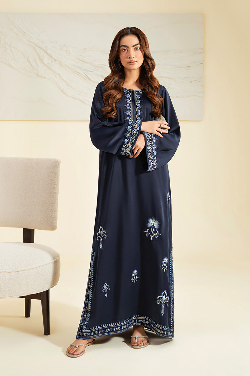 An elegant kaftan crafted for moments that call for effortless grace — from festive gatherings to birthday celebrations. The printed silhouette is adorned with delicate embroidered motifs and a beautifully detailed neckline, while flared sleeves and embroidered side slits add a touch of refined charm. A perfect blend of comfort and sophistication for your special occasions.