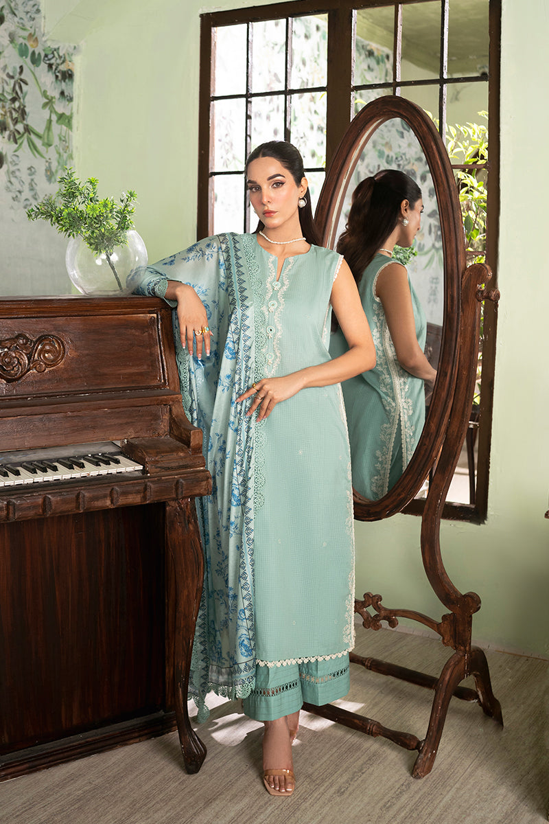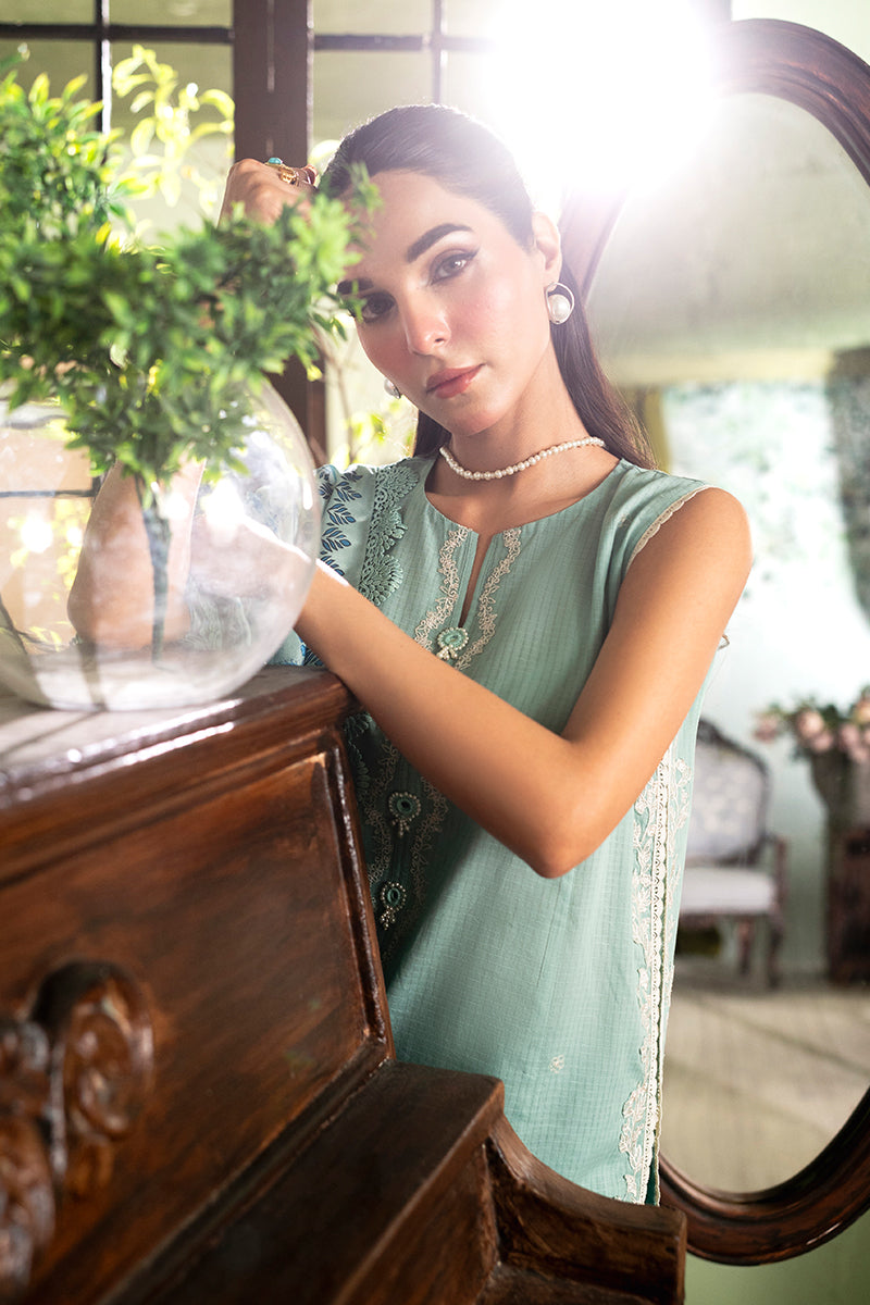 "Fauna" Comprised of Jacquard lawn with embroidered side panels and elongated embroidered neckline. The intricate embroidery on a soft hue makes this article a must have for this summer season. This is paired with same colour trouser. Accessorize it to complete the look and wear it to a high tea.