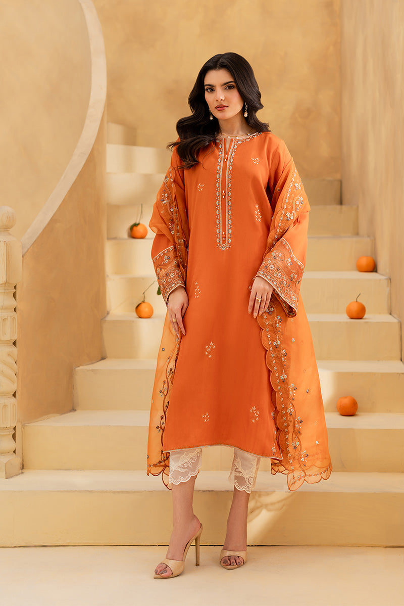 Glow with festive charm this Eid! This straight shirt features an embroidered neckline adorned with buttons along the binding adorned with delicate embroidered sprays that add subtle shimmer. Flared sleeves with intricate organza embroidery and heavily embroidered side slits complete the look. Styled with Eve Tulip shalwar and a scalloped cutwork organza dupatta, this ensemble is perfect for dawat nights, brunches, and every celebration in between.