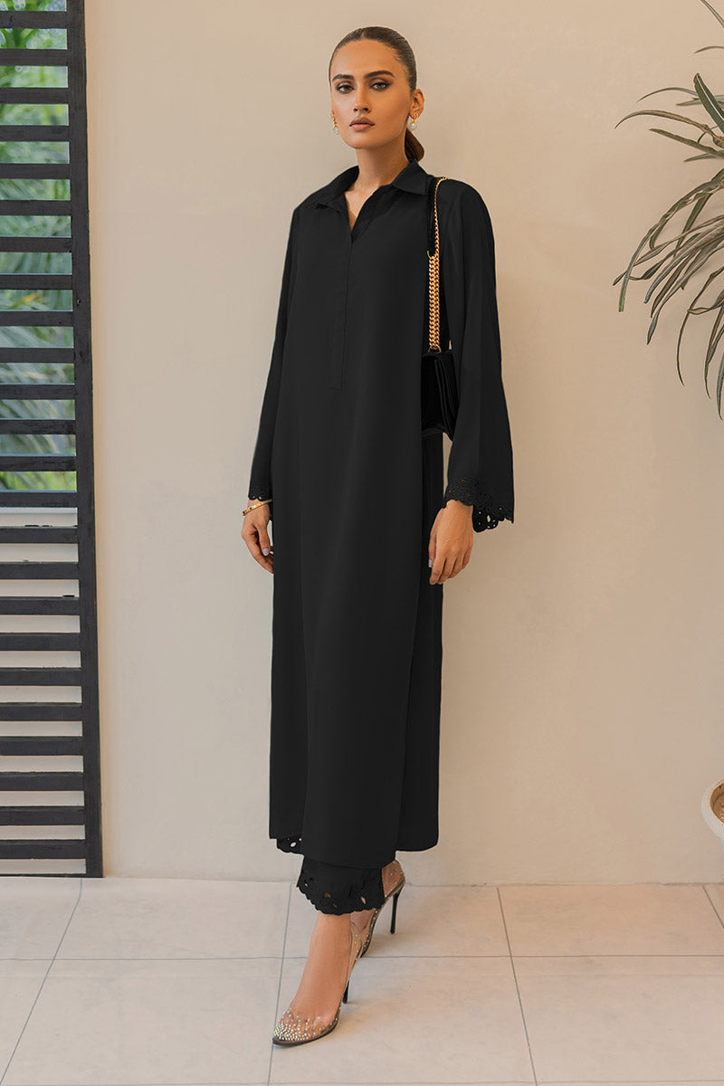 Indulge in elegance with our captivating black collared ensemble, 'Indira'. This two-piece set boasts intricate cutwork embroidery adorning both the sleeves and trousers, adding a touch of sophistication to your evening attire. Whether it's a romantic dinner or a night out