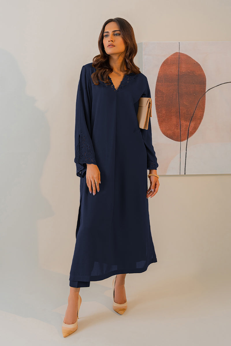 Immerse yourself in refreshing hues with ˜Isadora„¢, A navy blue two-piece set with cutwork embroidery on sleeves and neckline paired with matching straight trousers. Gives you a casual vibe with a touch of chic.