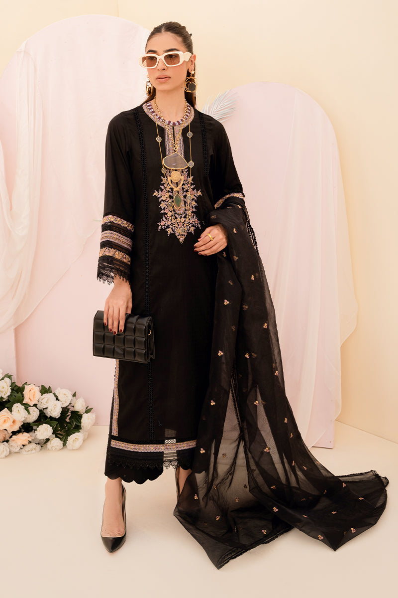 A solid black hued canvas of âLanaâ is artfully illustrated with intricately detailed embroidery depicting gold and lilac florals in bloom. Accompanied by an embroidered