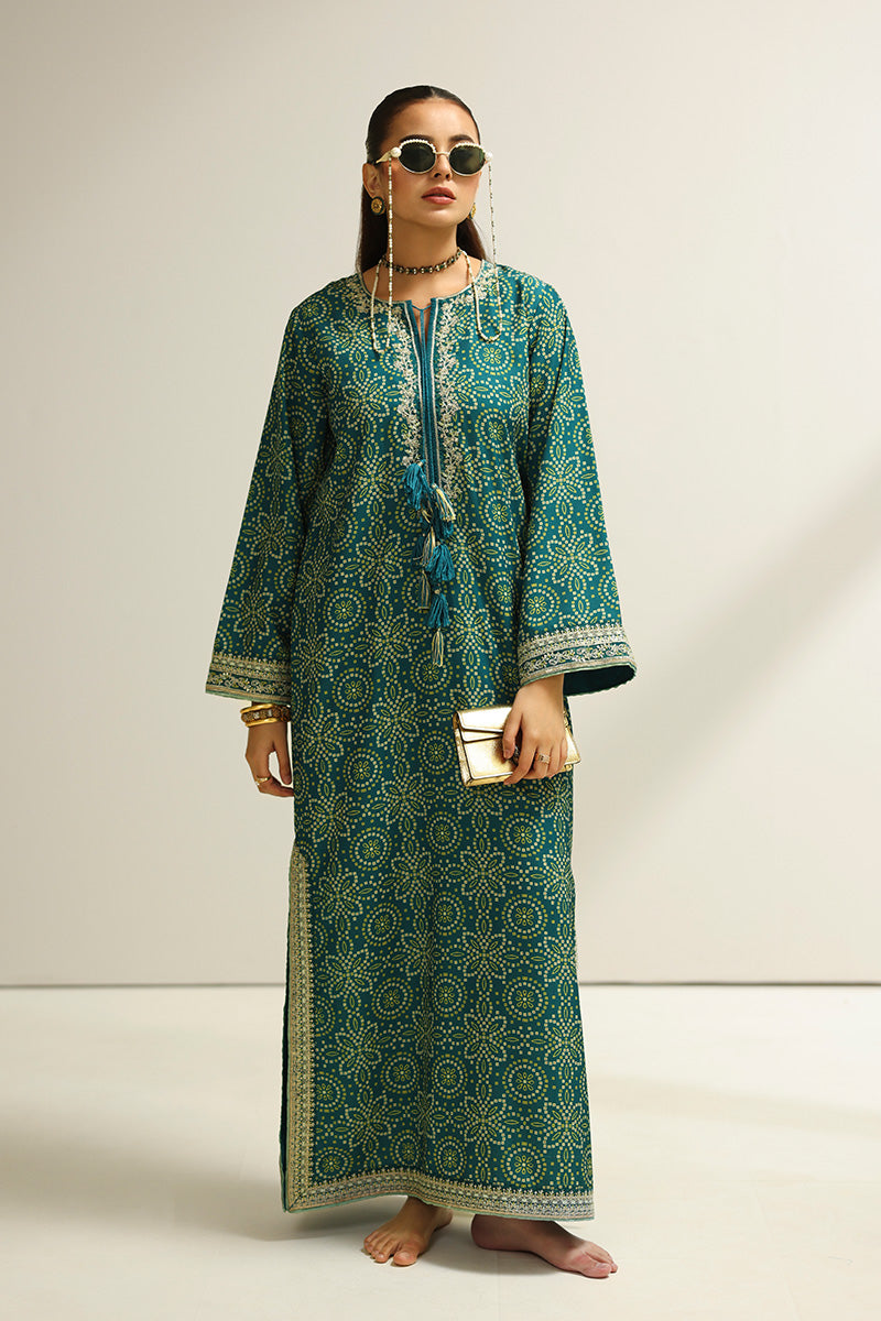 A timeless chunri kaftan crafted in a flowing silhouette, bringing effortless grace to every festive moment. The neckline is beautifully framed with gold embellishment and finished with luxe tassel details that sway with every step. Intricately embroidered sleeves and side seams add a rich, celebratory charm, making this piece the ultimate RSVP-ready ensemble—elegant, statement-making, and undeniably exquisite.