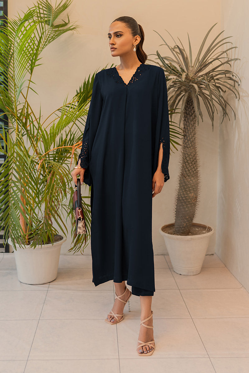 Immerse yourself in refreshing hues with Maris a navy blue two-piece set with cutwork embroidery on sleeves and neckline paired with matching straight trousers. Gives you a casual vibe with a touch of chic.