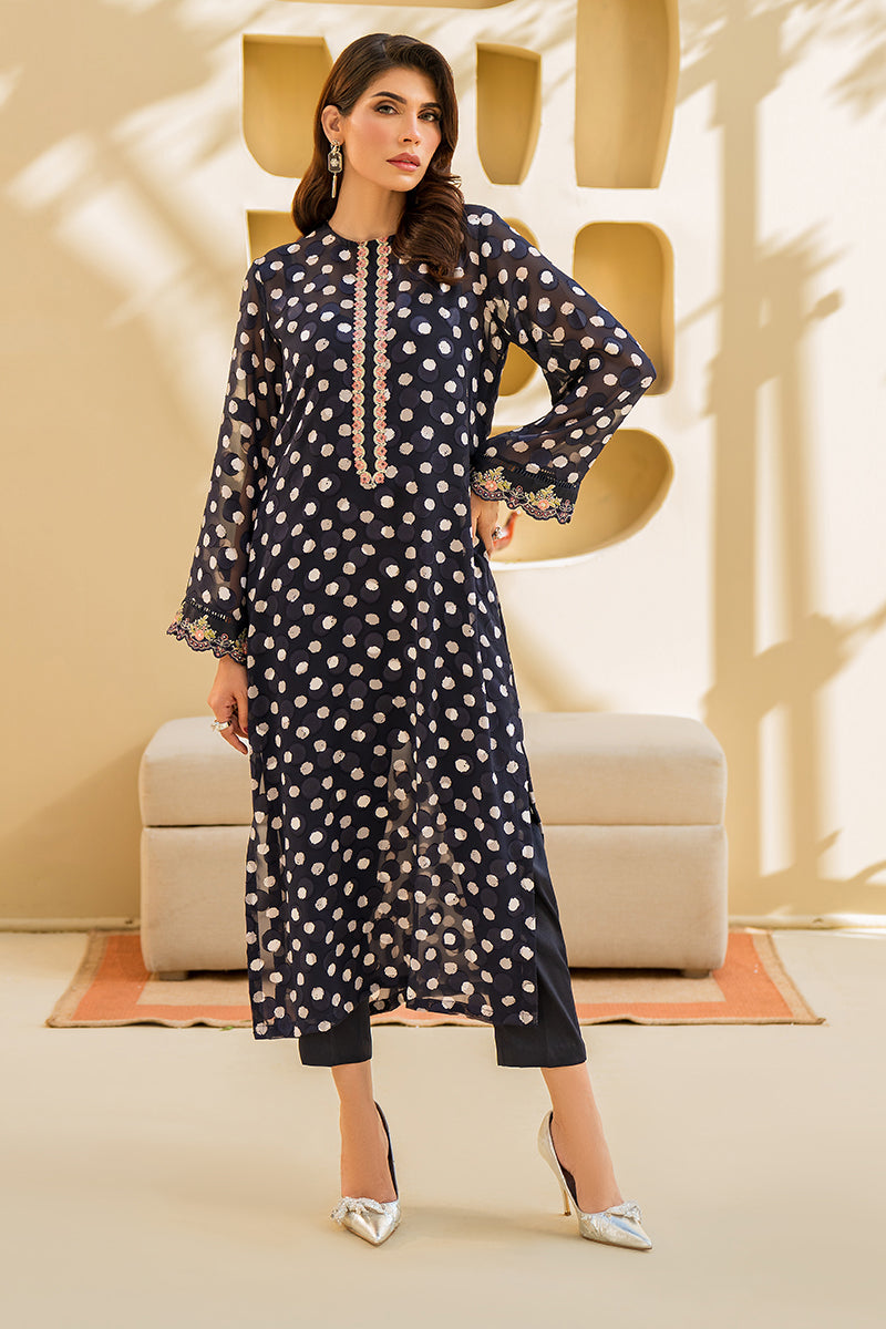 Miah-Take a dive into elegance with our navy bluechiffon outfit, which is adorned with exquisite polkadots pattern and intricate embroidery on shirt anddupatta. A timeless combination of sophistication andcraftsmanship.