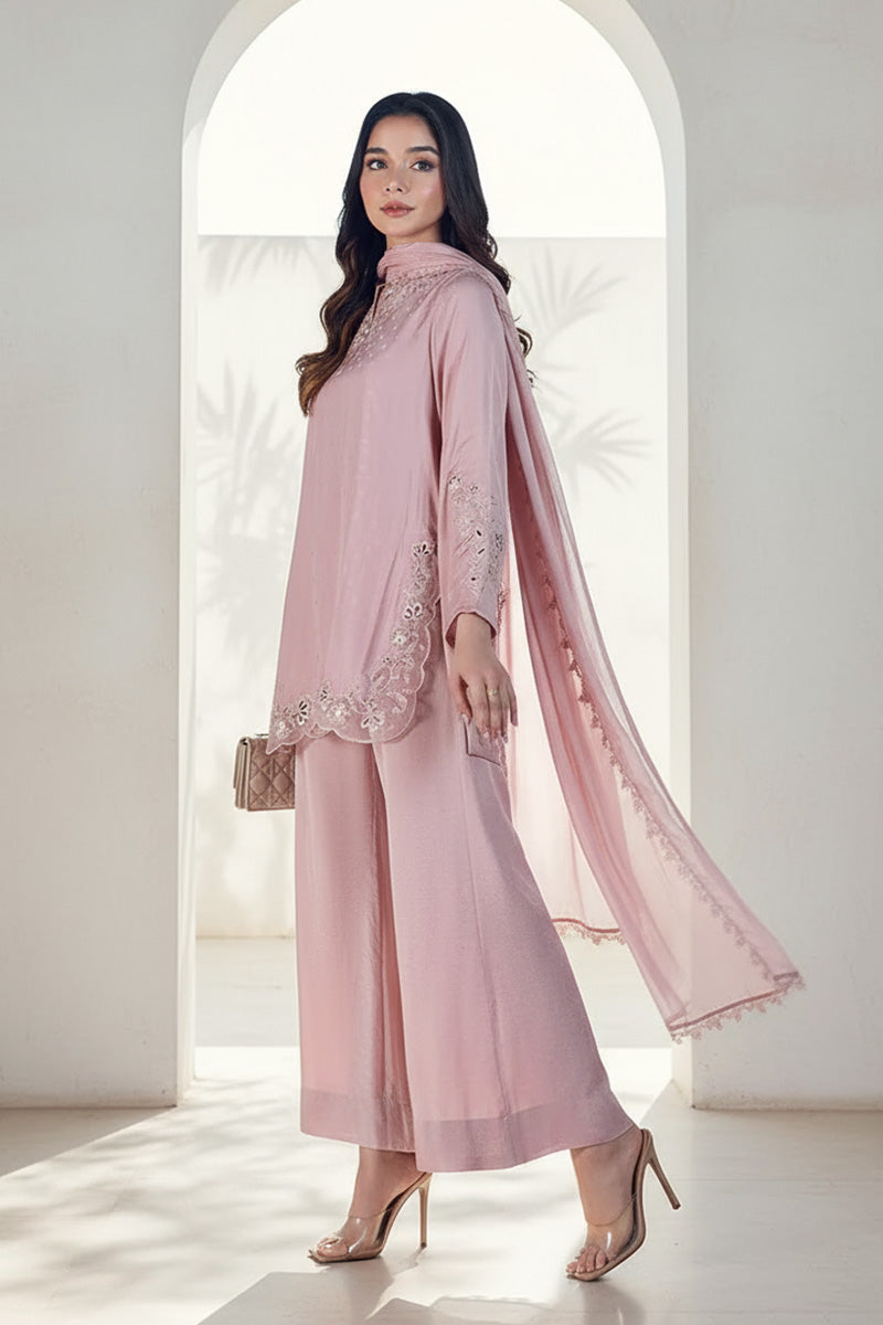Pink perfection! A short shirt with subtle self-print and delicate embroidery, finished with a heavily embroidered hem and flared sleeves. Paired with chic culottes and a silk dupatta for effortless festive grace.
