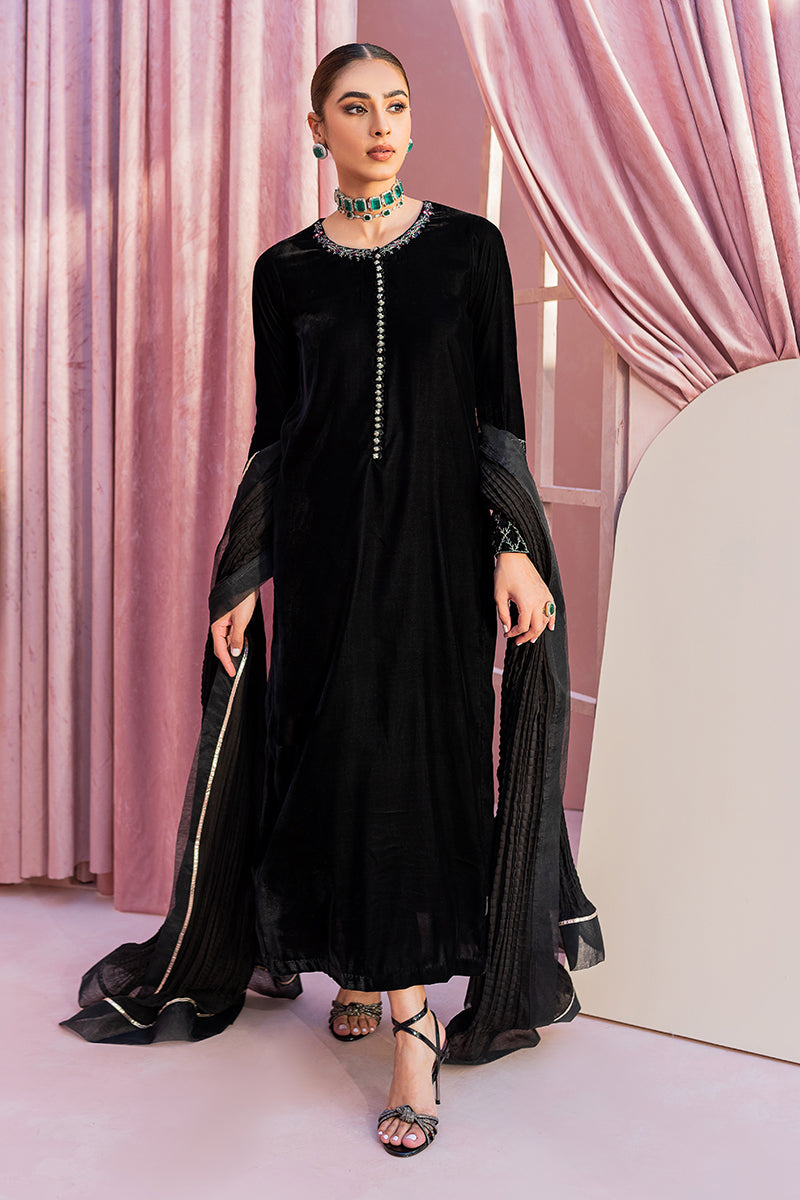 This timeless classic is a full sleeve velvet shirt, beautiful adorned with an embroidered button neckline. Its straight sleeves are enhanced with floral tilla embroideries. Layered over straight trousers and paired here with crushed silk dupatta this is a real call for a chic and monochrome look.